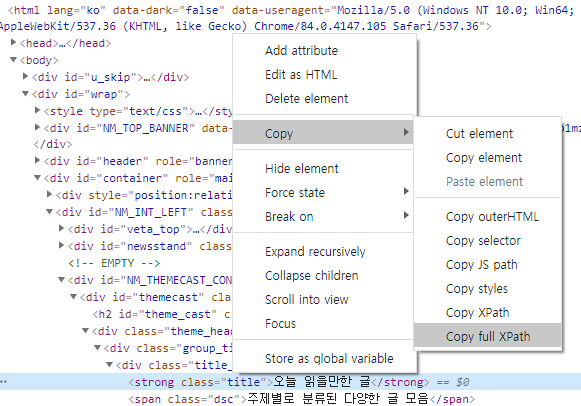 우클릭하여 Copy -> XPath를 복사 (XPath나 full XPath)