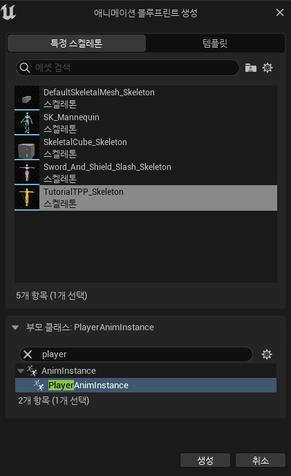 애니메이션 블루프린트 생성 시 새로 만든 AnimInstance를 부모 클래스로 선택